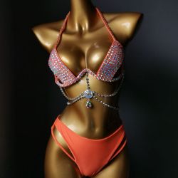 Novance Lingerie de haute qualité Vêtements de club pour femmes Couvre-cou en V profond Diamant Vêtements de plage Bikini métallique Performance Show 2 Pcs Sets